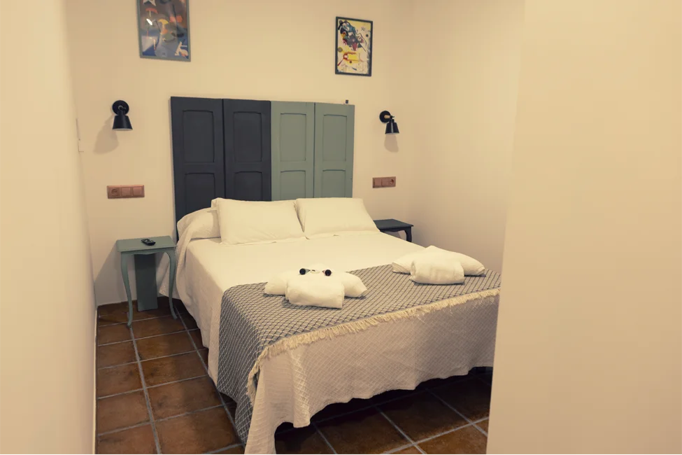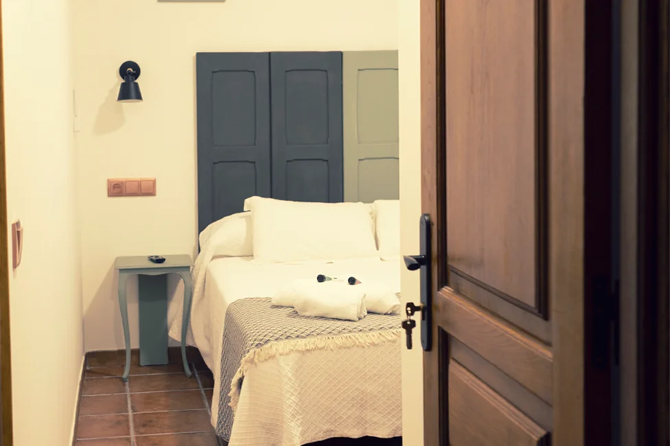 Acogedora habitación doble con baño privado, destacada por un original cabecero hecho con contras de ventanas antiguas, que aporta un toque tradicional dentro de un diseño moderno y confortable.